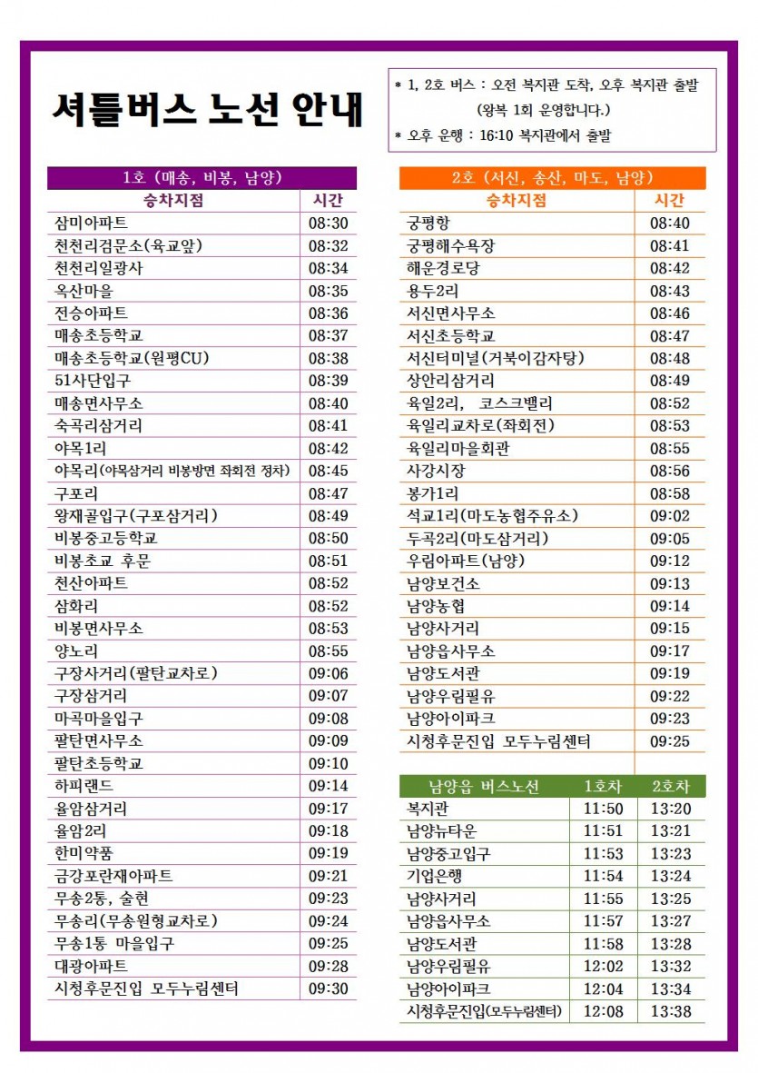 셔틀버스 운행 노선 안내
