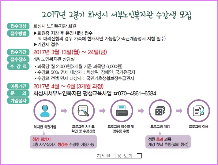 2017년 2분기 시간표 및 수강생 모집 안내 페이지 정보 작성자 관리자 댓글 0건 조회 10,557회 작성일 17-03-06 16:04 목록 본문 이전글독거노인돌봄기본사업 생활관리사 모집 17.03.10 다음글2017년 화성시서부노인복지관 경로당프로그램 강사 모집 17.02.28 댓글 0 댓글목록 등록된 댓글이 없습니다.